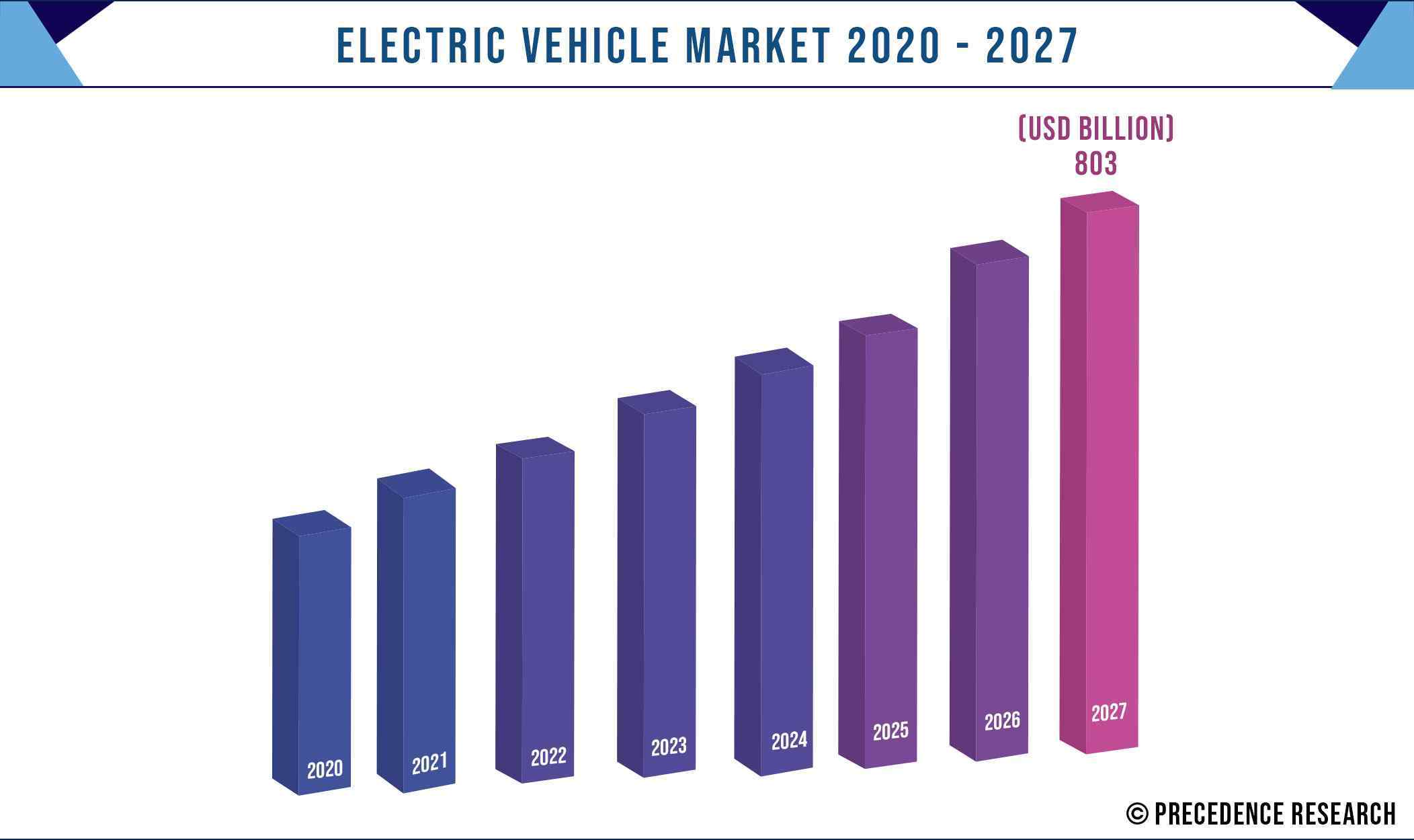 According to a new research report by Precedence Research, The electric vehicle market size is forecast to exceed US$ 802.81 billion by 2027 from USD 165 billion in 2020 and is expected to grow at the highest CAGR of 40.7% from 2020-2027. The report offers an up-to-date analysis regarding the current market scenario, latest trends, key drivers, potential challenges, profitability graph and the overall market environment.