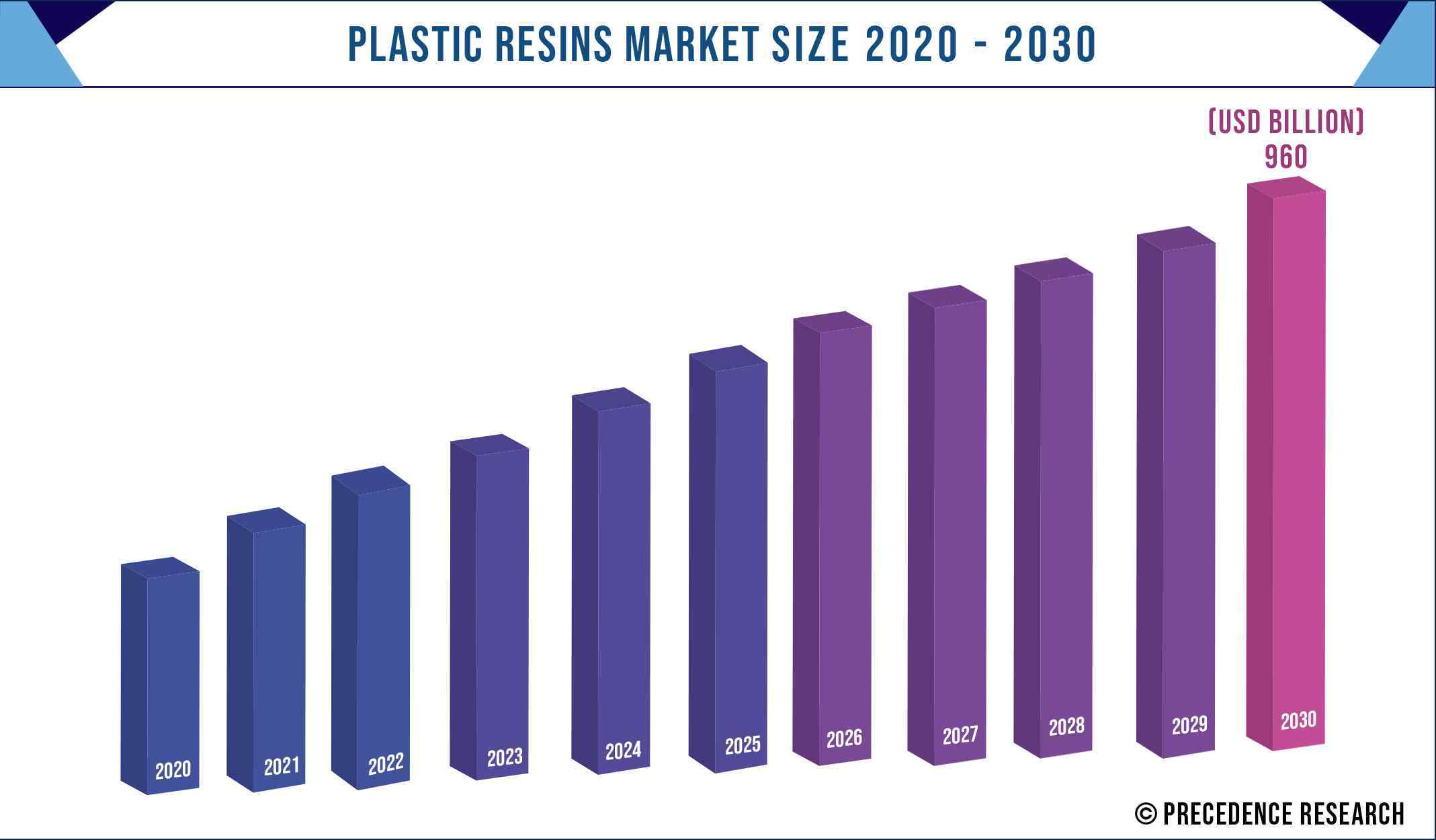 The global plastic resins market size is expected to reach US$ 960 billion by 2030 from US$ 682.50 billion in 2020 and is expected to grow at an impressive double-digit rate of 4.7% from 2021 to 2030.